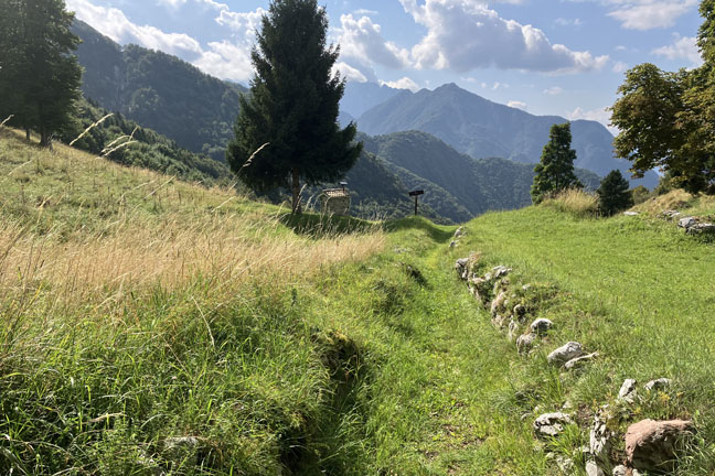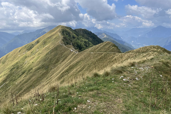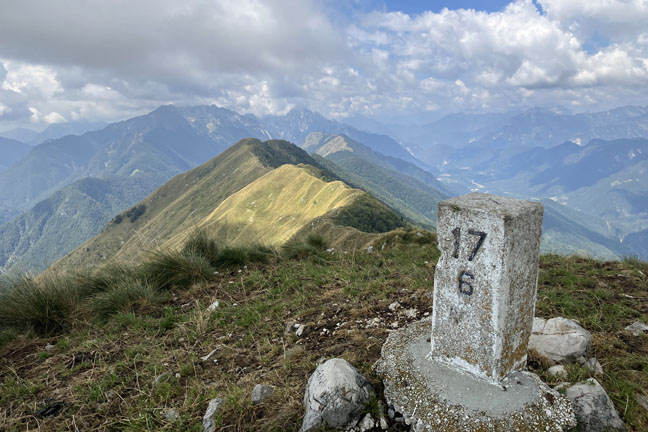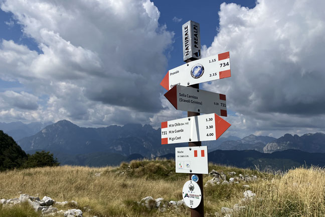 Medtem, ko se državna meja, ta poteka po grebenu z vrha Kanina (2587 mnv) preko Črnega Vogla (2422 mnv), Vrha Laške Planje (2448 mnv), pa Velike in Male Babe ter Skutnika, na Vrhu Planje zalomi in spusti proti dolini Učje, bomo mi nadaljevali proti zahodu po Sentiero 731. Najprej nas čaka kratek spust do razcepa na višini 1590 mnv, kjer se v dolino proti Planini Kal (Casera Caal) in Učji odcepi Sentiero 733. Sedemkilometrsko prečenje grebena od omenjenega razcepa pa vse do razpotja na planini Casera Nische, so na Trailforks poimenovali Cresta Sud Val Resia trail. Kakšni so občutki, ko kolesariš po grebenu Skutnika, tisoč metrov nad dolino Učje na eni in ravno toliko nad dolino Rezije na drugi strani, si poskusite pričarati s priloženih fotografij. Od razcepa nas najprej čaka nekaj sto metrov razgibanega terena, pa precej strm spust, ki mu sledi še bolj strm vzpon proti vrhu Monte Banera (1614 mnv), kjer bo kolo potrebno potiskati. Steza je posejana z večjimi ali manjšimi kamni, zato bo tudi pri spustu s kolesa mestoma potrebno sestopiti. Z Monte Banera se tik pod grebenom najprej spustimo do Senovika (1602 mnv) in naprej do Monte Urazza (1521 mnv). Nekaj sto metrov naprej pridemo do gozda, kjer nam pomanjkanje razgledov v celoti nadomesti steza, po kateri se na praktično idealni podlagi spustimo do sedla Predolina (Sella Pardulina, 1335 mnv). Na sedlu je razcep, proti vasi Korito se od tu spusti steza Sentiero 738. Sledi pol kilometra vožnje po idiličnem kolovozu in že pridemo do naslednjega razpotja pod vrhom Kila (Monte Chila, 1420 mnv). Bolje rečeno, našo pot preseka že omenjeni Sentiero 732, ki z rezijanske strani do tu vodi s sedla Cyrna Penć, od tu pa se spusti proti Učji. Po tabli sodeč gre za zahtevno pot namenjeno le izkušenim planincem.