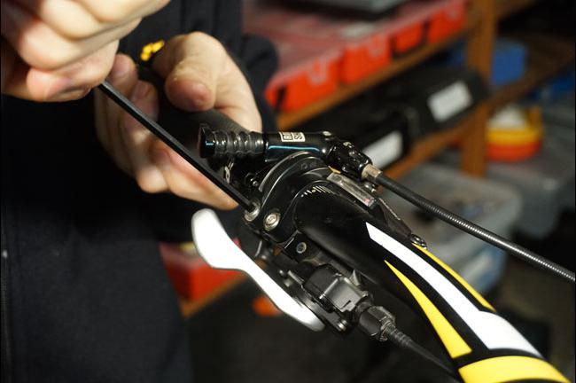 3 Z imbus ključem 4mm zrahljamo objemko tako zavorne kot tudi prestavne ročice. Če imamo na isti strani krmila tudi ročico upravljalnika potopne opore, s pomočjo Torx ključa T25 zrahljamo objemko in ročico zavrtimo tako, da nas pri delu ne bo motila. Z zavorne ročice odvijemo odzračevalni vijak in odstranimo tesnilo. Vijak in tesnilo odložimo tako, da ju bomo še kdaj našli. Položaj ročice naj bo pod kotom 45o. V odprtino pazljivo privijemo lijak za odzračevanje.
