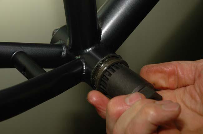 Z mastjo najprej namažemo navoj na kartuši in ga z roko privijemo v cev okvirja na pogonski strani (desna, gledano proti krmilu). Privijamo v nasprotni smeri vrtenja urinih kazalcev oz. proti zadnji strani kolesa. Ko ne gre več s prosto roko, s ključem za os pogona in viličastim ključem 24mm kartušo močno privijemo.