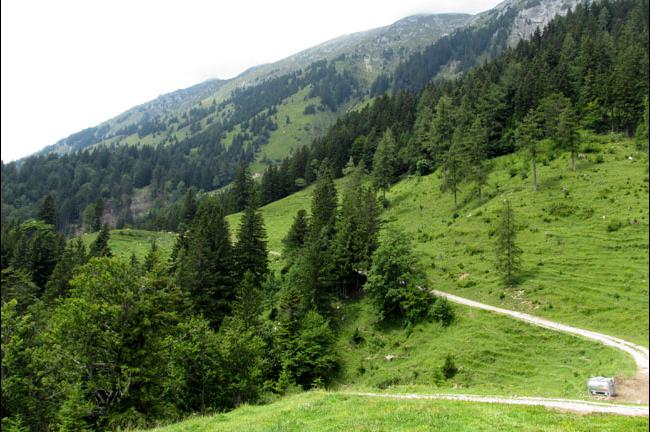 S spustom začnemo po označeni poti v smeri Lešanske oziroma Bistriške planine. Najprej se spustimo čez par korenin, se zopet malo vzpnemo in kaj kmalu se pot spremeni v vlako. Čez dober kilometer na levi strani nad seboj uzremo Lešansko planino. Cesta postaja vse boljša in hitro se znajdemo na Breški planini. Tik za Breško planino cesta zavije desno in že čez dobrih sto metrov se na levi strani ceste nahaja Bistriška planina. Če bi pot nadaljevali v tej smeri, bi nas cesta pripeljala v dolino v Brezjah, kar pa ni bil naš namen. V prej omenjenem desnem ovinku, spoznate ga po parkirišču in napajalniku za živino, se levo in v hrib odcepi neoznačen kolovoz. Krenemo po kolovozu. Že zelo kmalu se od kolovoza odcepi od koles lepo zvožena pot, po kateri se spustimo do ceste proti dolini Mošenika (590m). Na cesti zavijemo desno proti dolini. Na levo se cesta konča čez približno 250 metrov. Ta del poti, sicer v nasprotni smeri, pa vendar, »pripada« turi K-31.