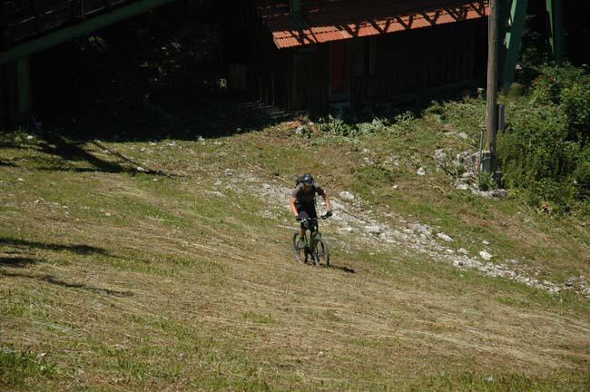 Tisti, ki jim je za žig in vzpon na vrh malo mar, bodo na omenjenem razpotju kar takoj krenili desno, do zgornje postaje dvosedežnice in si raje privoščili par voženj po mtb parku Javornik. Za kočo pod vrhom smučišča se spustimo po travniku levo in navzdol. Prečimo vzdrževalno cesto in se po smučišču kar počez odpeljemo do gozda. Kar sledi (rdeča proga), je za park nevajenega kolesarja, opremljenega s trdakom prej mučenje kot užitek. Kakorkoli že, končno sem se prebil do gozdne ceste, nekje na sredi spusta. Od tu naprej je možno izbirati stopnjo trpljenja. Poslušal sem nasvet mlajših in jo mahnil po progi »precednik«. Ni mi bilo žal, precej »gladka« pot z nekaj »bandami« in v hipu sem bil na spodnji postaji. Tu je bife, pa servis in predvsem množica adrenalina željne mularije, v navdušeni debati kje in kako jo je kdo »odkrivil« v dolino. Zelo pozitivna scena.