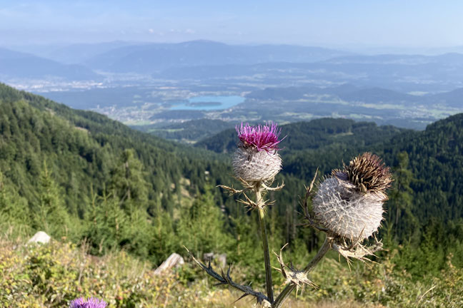 Najprej je bilo treba poiskati žrtev, ki nas bo peljala čez Korensko sedlo, se vrnila v Kranjsko goro in naš avto pustila na parkirišču ob jezeru Jasna. Še so dobri ljudje na tem svetu, in vse na kar smo morali misliti so bili rezervni ključi. Izpred kopališča ob Baškem jezeru (Faaker See) smo se odpravili proti železniški postaji. Podvoz pod železniško progo nam omogoči, da na drugi strani po Faakerseestrasse pot nadaljujemo proti zaselku Ranitz. Ko pridemo v Ranitz se držimo levo in se po ulici Karawankenweg zapeljemo dobrih tristo metrov do križišča, kjer sledimo oznakam za Altfinkenstein. Po dveh kilometrih zmernega vzpona prečkamo potok Rožca (Rotschitzabach), kjer cesto prečka Latschacher Trail – T29, ena izmed osemindvajsetih urejenih gorskokolesarskih stez v okolici Baškega jezera, združenih v sistemu »Lake-Bike«. S konkretnim vzponom nadaljujemo še približno kilometer, ko se na ostri serpentini na desno odcepi cesta proti ostankom gradu Finkenstein. Bivša graščina je preurejena v prizorišče številnih kulturnih in turistično kulinaričnih dogodkov (Burgarena Finkenstein). Na razcepu dvesto metrov naprej se držimo spodnje, leve ceste. Glavna se nadaljuje proti gostišču Baumgartnerhof, pa tudi do izhodišča za večino omenjenih kolesarskih trailov je potrebno nadaljevati po tej cesti. Želja po zabavi nas je močno vlekla na desno, a smo premagali skušnjavo in po ozki asfaltni nadajevali cesti še petsto metrov, do s soncem obsijane jase, kjer se na desno odcepi makadamska cesta proti sedlu Annahüttensattel (1580 mnv).