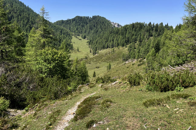 Vrnemo se do sedla in se pričnemo spuščati po gozdni cesti na slovensko stran. Cesta je lepo speljana, je pa vsekakor že videla boljše čase. Na skoraj pet kilometrov dolgem spustu do mosta čez Belco, se nam mestoma odpirajo pogledi proti Julijcem. Na drugi strani betonske brvi čez Belco se cesta razcepi. Leva cesta je tista, zaradi katere smo izhodišče izleta prestavili v sosednjo državo, zato se držimo ožje, desne ceste. Pa čeprav se bo potrebno ponovno vzpenjati. Do planine Mikulovica (1389 mnv), od koder si piramidasti vrh Kepe ogledamo še z južne strani, nas čakata slaba dva kilometra vzpona s konkretnim, deset odstotnim naklonom. Do sedla med Mojstrovico (1816 mnv) in Tišlerico (1757 mnv) so nam ostali še trije kilometri vožnje. Cesta v nadaljevanju je za odtenek položnejša, z vsakim metrom ožja in bolj poraščena z nežno travo. Zadnjih nekaj sto metrov pred sedlom (1641 mnv) od ceste ostane le še ozek kolovoz, kjer vožnjo dodatno otežujejo kupi odkrušenega kamenja. S sedla okoli vrha Tišlarice proti Veliki Trati (1645 mnv) vodita dve stezi. Leva, bolj uhojena se je izkazala za primernejšo. Prvih tristo metrov bomo kolo pretežno potiskali, temu pa sledi kratek, a izjemno lep spust do sedla Velika Trata med Tišlerico in Grajščico (1760 mnv). S sedla se proti zahodu spušča prostrana, z gosto zeleno travo in čudovitimi macesni poraščena dolina. Na severovzhodni strani sedla smo poiskali travnato stezo proti planini Grajšca in po štiristo metrih, ko smo se končno »prerinili« iz gozda, z desne strani ugledali vrh Kresišča (1839 mnv). Pod seboj pa čudovito živo zeleno gorsko dolino, kjer so se pasle številne krave. Dosegli smo najvišjo točko izleta (1716 mnv).
