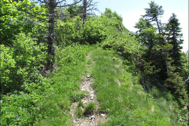 Na ostrem desnem ovinku prikolesarimo do lovske koče. Juliana trail se mimo koče nadaljuje po pešpoti naravnost proti Vrhu Bače, mi pa nadaljujemo z vedno hujšim vzponom po slabi makadamski cesti. Ko na višini 1250 metrov pridemo do poseke in lovske preže, je vrag odnesel šalo. Naša pot se nadaljuje po izredno strmem kolovozu, ki mu resnici na ljubo nismo bili kos, dasiravno je bila podlaga odlična. Med potiskanjem kolesa je bilo dovolj časa, da smo se občasno ozrli nasprotno od smeri vožnje, oziroma bolje rečeno, smeri potiskanja. S točke, neposredno nad predorom bohinjske železnice, se nam je odprl prečudovit pogled na vrhove, kjer smo leta 2016 prevozili eno naših najlepših tur. Na skrajni desni strani je vrh Lajnarja, prepoznamo ga po smučarskih žičnicah, sledita Slatnik in Možic, ter na levi strani Šavnik.