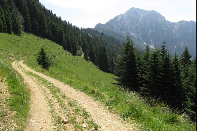 Spustil sem se torej do »glavne« ceste ter se na levo spustil v dolino. Po približno treh kilometrih od koče peljemo naravnost, cesta na desno v dolino pelje proti Grahovšam. Še slab kilometer blagega spusta (1120m) potem pa nas čaka zopet vzpon. Na tem mestu je tabla, kjer piše »Planina Javornik 4km. Ni panike. Le da se je izkazalo, da jih je več kot sedem! Od tu do mesta, kjer je na karti vrisano zavetišče GRS ni nobenih odcepov, zato človek kljub precej hudemu vzponu« laže zadiha«. Od zavetišča (1460m), ki to sploh ni - oskrbnik koče na Planini Javornik mi je pojasnil, da gre za privatno hišo - se po kolovozu sprva spustimo nekaj deset metrov in se kmalu začnemo zopet vzpenjati. Slab kilometer od zavetišča pridemo do križišča. To je križišče s cesto, po kateri bi prišel na Javornik, če ne bi zgrešil odcepa na Planini Vetrh. Še en kilometrski ovinek, par čudovitih razgledov na severno steno Storžiča ter pašnike polne krav in že sem bil pri koči na Planini Javornik (1540m).
