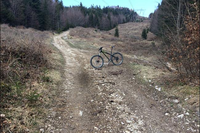 Nasproti spomenika se na levo navzdol odcepi kolovoz. Sprva poteka po izredno gosto zaraščenem gozdu, zato je precej temačen. V srednjem delu je precej zgaran, je pa vožnja ob robovih pravi užitek. Ko pridemo do izravnave, kjer se kolovoz na desno nadaljuje z gozdno cesto, se lahko držimo levo in nadaljujemo po slabo zvoženem kolovozu. Oba kraka, tako cesta kot kolovoz nas v hipu pripeljeta do tomišeljske ceste. Ker smo pot nadaljevali v smeri Gorenje Brezovice, pod zavetiščem na Kavcu, smo se držali levega, malenkost zahtevnejšega kolovoza, saj le ta neposredno prečka Tomišeljsko cesto in se nadaljuje proti dolini. Če bi kljub temu izbrali desno, boljšo pot, nas ta do ceste pripelje kakih sto metrov niže v smeri proti Tomišlju.
