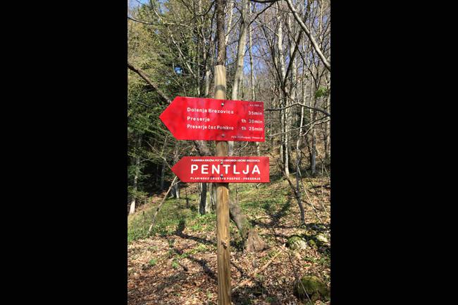 Prečkamo cesto in nadaljujemo po kolovozu. Ta nas tik pod zavetiščem na Kavcu in spominski plošči padlim borcem NOB (6) pripelje do ceste, ki na desno vodi proti Gorenjii Brezovici. Blago se spuščamo po grobi makadamski cesti, na nekaj mestih se nam odpre pogled v dolino na Gorenjo Brezovico, osamelec s cerkvijo Svete Ane in Ljubljansko Barje v ozadju. Po dveh kilometrih in pol, na široko speljanem levem ovinku zapustimo cesto in krenemo po slabem kolovozu desno in navkreber. Tudi tu je kolovozov in pešpoti kar nekaj. O prevoznosti ne bi, se mi pa zdi, da bi se moral še tak junak zelo potruditi. Ne glede na to, po kateri poti krenemo, bomo po vsej verjetnosti prišli do kolovoza proti Planinci. Načeloma velja, bolj desno – bolj strmo. Pa še više bomo prišli na kolovoza proti Planinci.