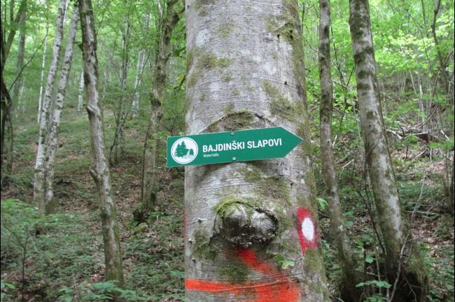 Od gradu se vrnemo do prvih hiš pod gradom, kjer nas smerokaz usmeri proti pokopališču in Bajdinškim slapovom. Od pokopališča nas čaka zanimiv, čisto prekratek spust po gozdni stezi do dna soteske Bajdinškega potoka. Prečkanje potoka nam omogoči lesen most. Na drugi strani pustimo kolo in se ob desnem bregu potoka po ozki stezici peš odpravimo do prvega slapa. Od tu naprej v kolesarski obutvi ne bo šlo, zato se vrnemo do kolesa in nadaljujemo s spustom v dolino. Do glavne ceste pridemo v bližini mesta, kjer se Bajdinški potok izliva v Želimeljščico. Tik nad strugo slednje nadaljujemo z vožnjo po ozki asfaltni cesti v smeri Želimelj. Po treh kilometrih in pol, tik za prvimi hišami, zapustimo asfalt in zavijemo levo na makadamsko cesto proti Rogatcu. Čaka nas nekaj manj kot tri kilometre precej strmega klanca, a kot se izkaže v nadaljevanju, se izplača potrpeti.