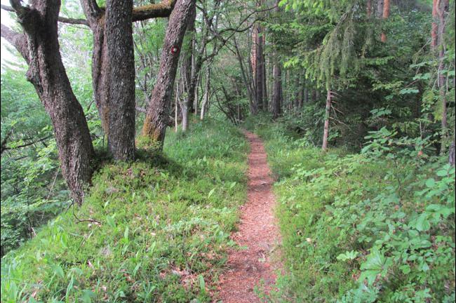 S parkirišča pod cerkvijo se proti Zapotoku odcepi kolovoz, ki nas po le stotih metrih pripelje do razcepa dveh pešpoti. Ne glede na to, po katerem kraku se odpravimo, v vsakem primeru pridemo do Zapotoka. Krenili smo po desni, označeni kot Zapotoška učna pot. Sledi kilometer uživaškega spusta po čudoviti gozdni stezi. Ko tik za »zeliščnim vrtom z energijskimi točkami« pridemo do prvih hiš, s spustom nadaljujemo do RTC Zapotok. Držimo se desno. Vozimo do prvega križišča, kjer zavijemo levo v smeri Brezja. Ko se naselje konča, nadaljujemo naravnost po gozdnem kolovozu. Na prvem razcepu si privoščimo naslednjega iz vrste manj posrečenih vložkov. Krenemo po slabšem, levem kolovozu proti vrhu Gričnice (711m). Če je kolovoz spočetka še kar »prebavljiv«, proti vrhu zaradi ostankov goloseka postaja bolj kot ne neprevozen. Ko se prebijemo okoli vrtače na vrhu Gričnice, kolovoz postane zopet za silo prevozen. Ko pridemo do razcepa se držimo levo in se po kombinaciji kolovoza in enoslednice, poldrugi kilometer navdihujoče spuščamo proti zaselkoma Gračevca in Laze.