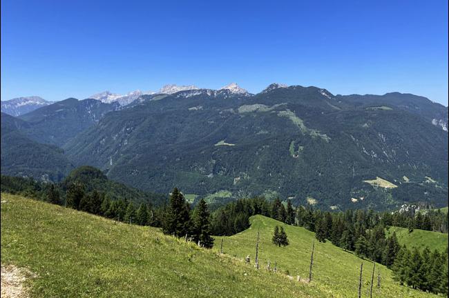 Po cesti sva nadaljevala le kakih sto metrov in prišla do mesta, kjer cesto prečka pešpot iz Podvolovljeka (razpotje Riher) proti Lepenatki. Tu velja biti pozoren, saj zaradi preraščenosti oznake niso dobro vidne in se po cesti lahko spustite predaleč navzdol v smeri Luč. Krenila sva po strmi pešpoti. Kolo je treba del poti prenesti, v nadaljevanju pa ga lahko do sedla Kal (1285m) potiskamo. Na sedlu, med vrhovoma Veliki Rogatec in Lepenatka (1426m), stoji manjši bivak. Ker ta dan na celi planini, razen črede krav ni bilo žive duše, sva si na »terasi« pred bivakom privoščila krajši počitek pred zaključnim vzponom. S sedla na Kalu sva se po shojeni stezi odpravila desno, proti vrhu travnatega gorskega vrha. Pot je precej strma, zato sva ob kolesu večino čas prepešačila. Z nekaj dobre volje bi lahko tu in tam kakšen krajši odsek tudi odpeljala, ampak... Na vrhu grebena pridemo do smerokaza od koder nas čaka do vrha le še nekaj deset metrov, bolj kot ne po ravnem. Na vrhu naju je čakala vpisna knjiga in žig. V razgledih sva uživala že malo prej, s klopce pred bivakom, ampak z vrha so ti še precej bolj veličastni. In to na čisto vse strani. Poleg Velikega Rogatca v neposredni bližini, nam pogled seže na Golte, Menino planino, Kašno in Veliko planino, v smeri proti osrednjim Kamniško-Savinjskim Alpam pa najlepše vidimo vrhove Korošice, Ojstrice in Planjave.