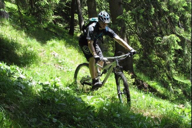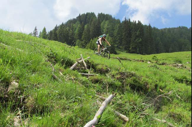 Pot 503 pa se seveda nadaljuje. Ne vem zakaj, a dobila sva občutek, da te pešpoti že dolgo ni nihče uporabljal. Takoj za mejo je trava neshojena, še dobro da so markacije dobro vidne, sicer poti gotovo ne bi našla. V gozdu je na večjem delu poti debela plast listja, vožnje po njem se mi je zdela na las podobna smučanju v celem snegu. Na poldrugem kilometru, ko pridemo do kolovoza, se spustimo za slabih 350 višincev. Ali povedano drugače, povprečna strmina na tem delu je približno 25%. Sam sem sicer nekajkrat sestopil, da pa je trail v celoti prevozen, mi je demonstriral Samo. Noro! Ko sem prišel (v enem kosu) do pašnika in kolovoza pod njim, sem občutil pravo olajšanje in veselje v isti sapi. V vročem dnevu je bistra hudourniška voda prišla kot naročena.