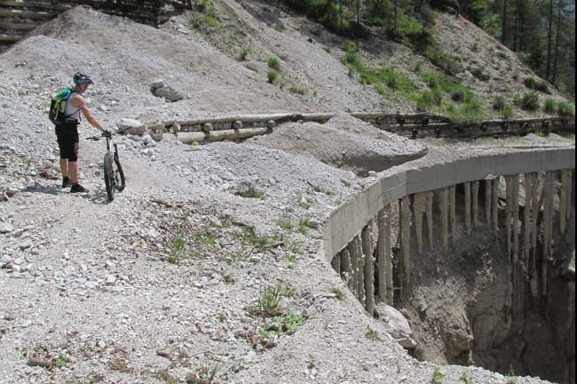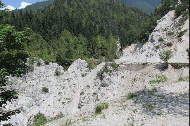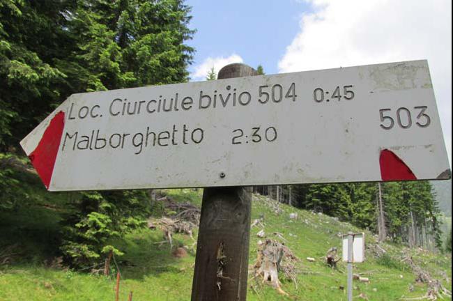 Na naslednjem kilometru in pol bolj kot ne ravne makadamske ceste, sva prečila rajsko planoto, na karti označeno kot Ciurciule. Vmes sva imela kar nekaj dela z odpiranjem lese pri Chiesetta del Boscaiolo. Prišla sva do križišča. Cesta na levo in navkreber (trail 504) gre proti Sedlu Colarica, mi pa se držimo desno proti dolini. Na tem sicer zelo enostavnem razpotju sva imela kar nekaj pomislekov. Smerokaz namreč kaže, da je to pot 503 za Naborjet (Malborghetto), na karti pa pot po hudourniški dolini (Vallone di Malborghetto ) po kateri sva hotela, nima nobene oznake. A kmalu se je izkazalo, da je pot prava. Slikovita, nezemeljska!