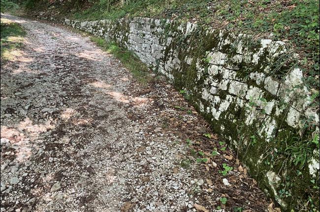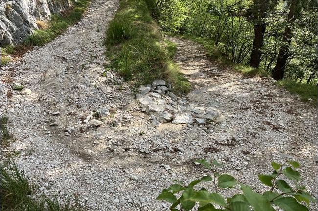 Tik za kmečkim turizmom se prične mulatjera. Ta spočetka bolj spominja na gozdno cesto, kot na stezo namenjeno oskrbovanju vojaških položajev na Monte Grappi. O tem, da so jo gradili mojstri , pričajo po več kot sto letih še vedno brezhibne kamnite škarpe, utrjeni spodnji robovi cestišča, predvsem pa uporabnikom prijazen naklon cestišča.