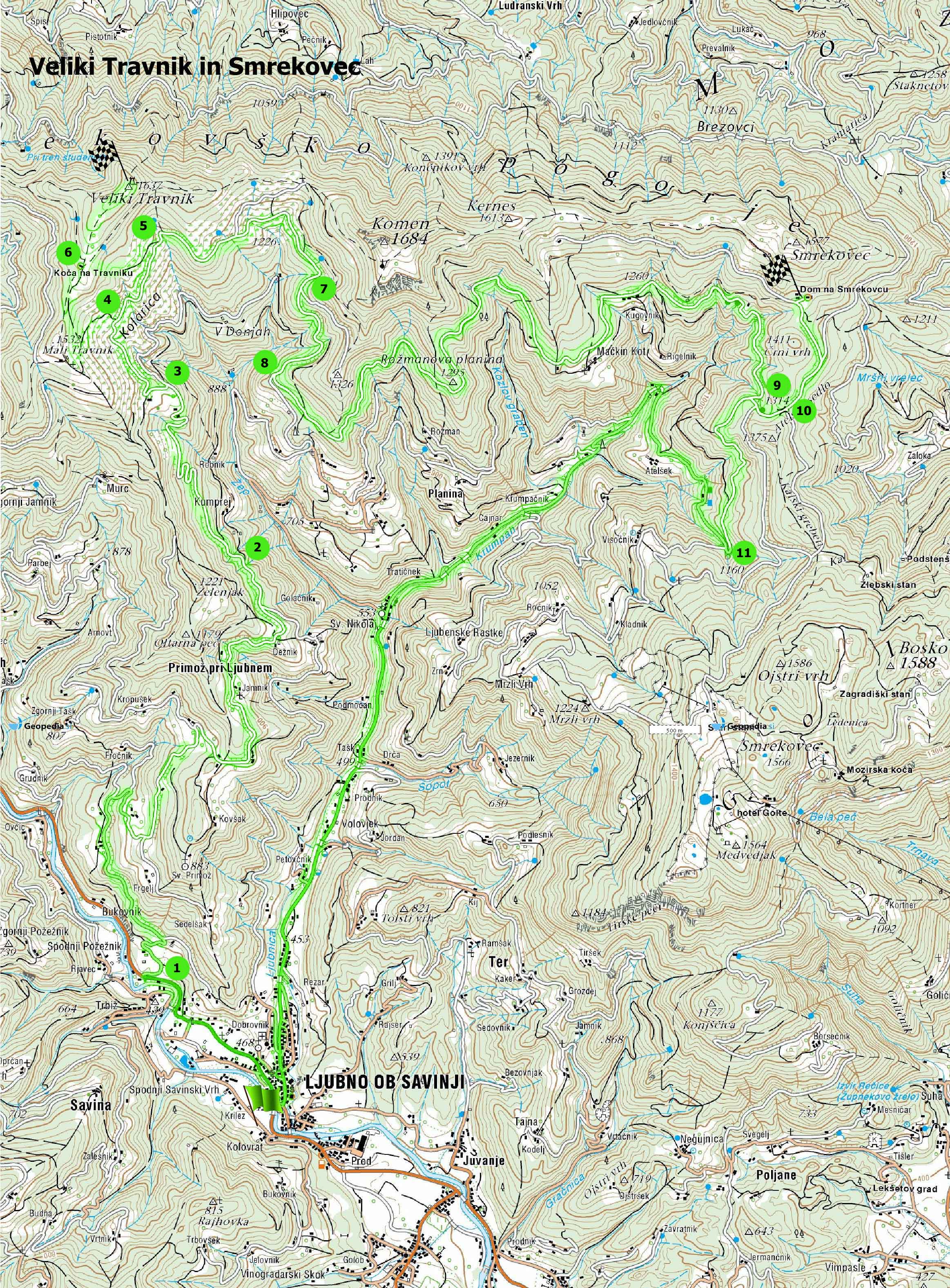 Od stolpa do koče (6) se vračamo po isti poti in nadaljujemo mimo koče po travniškem kolovozu. Pod kočo so luže za napajanje živali, tu se držimo levo. Potrebno je odpreti ogrado. Lepo prevozen kolovoz nas pripelje do ceste na mestu (4), ki smo ga gor grede prevozili (prvi kažipot za Travnik). Zavijemo levo, po enkrat že prevoženi poti, mimo mesta, kjer smo se odcepili za Travnik (5). Čez kilometer pridemo do odcepa in parkirišča za Komen. Nadaljujemo po cesti, zelo kmalu se odcepi na desno pešpot za partizansko bolnico Mrzle vode (10 min). Čez približno kilometer in pol se cesta razcepi (7). Leva cesta je slepa, zato gremo po desni. Slaba dva kilometra od tega razcepa se ostro levo odcepi gozdna cesta (8), glavna pa nadaljuje v dolino proti Planini. Če nimamo časa ali moči, gremo lahko tudi po tej, saj je precej krajša, v nasprotnem primeru pa nadaljujemo po gozdni cesti, kakih deset do dvanajst kilometrov, malo gor, malo dol. In seveda malo po ravnem. Cesta deluje precej “panoramska”, kot nekakšna polica pod Rožmanovo planino. Mestoma se ponujajo lepi razgledi na dolino, na Golte in Smrekovec… Cesta je na trenutke kar precej zaraščena, tako da se nisem mogel znebiti občutka, da le redki zaidejo nanjo. Za kolesarja, ki ne mara asfaltnih prometnic pravi raj, skratka. Pot nas pelje nad gorskimi kmetijami v Mačkinem kotu, mimo kmetije Kugovnik, od koder je le še par kilometrov do križišča (9), kjer odcep levo in navzgor pelje proti Smrekovcu, desno navzdol pa proti asfaltni cesti za Ljubno. Ker do Doma na Smrekovcu ni daleč, ga je vredno obiskati. V Ljubno se vračamo po isti poti, mimo odcepov za Stare Stane in Golte (10), mimo križišča od koder smo prišli (Kugovnik), pa do asfalta za Ljubno (11).