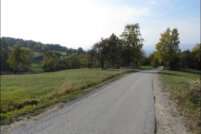 Od spomenika smo s spustom skozi vas nadaljevali kar po asfaltni cesti, tik pod vasjo pa zavili levo, na slabo viden, a dobro utrjen kolovoz proti kartuziji Pleterje. V Apneniku pridemo do prvih hiš in kasneje do asfaltne ceste, po kateri se spuščamo do samostana. Ko se spustimo do parkirišča, na levi strani ugledamo Muzej na prostem Pleterje, na desni pa samostansko obzidje. Kartuzija je za obiskovalce zaprta, si je pa možno od zunaj ogledati vsaj delček res veličastnega kompleksa. Z vožnjo nadaljujemo ob samostanskemu obzidju v smeri proti severozahodu. Po približno stotih metrih zavijemo ostro desno v smeri Drče in vztrajamo z vožnjo ob samostanskem obzidju. Slab kilometer vozimo po ozki asfaltni cesti, na eni strani omejeni z obzidjem, na drugi pa s skrbno negovanimi vinogradi. V zaselku Drča zavijemo levo in se skozi vinograde dvignemo do glavne ceste, kjer zavijemo desno proti vasi Mali Ban. Tu se moramo resda ponovno povzpeti, a slikovita vinogradniška pokrajina odtehta dodatni napor. V vasi se držimo levo in se preko Volčkove vasi počasi spuščamo proti izhodiščni točki.