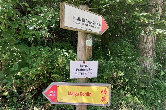 Nadaljevala sva torej s spustom, najprej nepoln kilometer do Borgo Prabunello, od tu pa še poltretji kilometer do v skalo izklesanega tunela, za prečenje katerega je priporočljiva uporaba naglavne svetilke. Vse od planine Ledis kolesarimo bodisi po makadamu, bodisi po betonu, odvisno od tega, kako strma je pot. Izza tunela, pa vse do cilja kolesarimo po ozki asfaltni cesti. Najprej se visoko nad strugo potoka Venzonassa dobre tri kilometre spuščamo do »predmestja« Venzona imenovanega Pragjel, potem pa še slab kilometer do parkirišča.