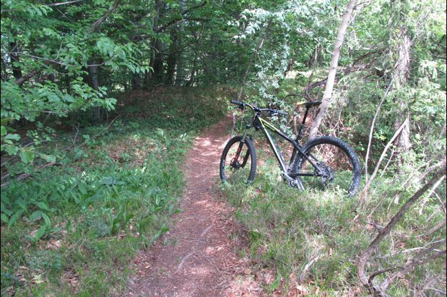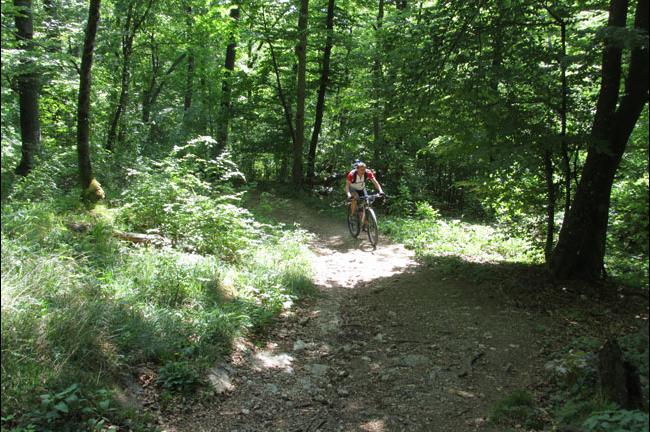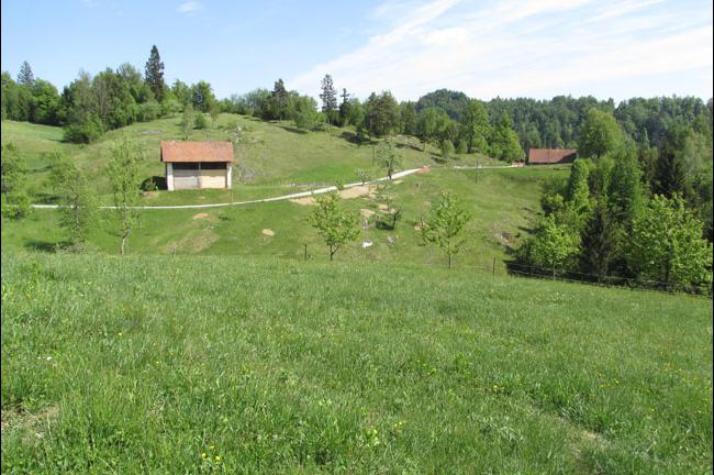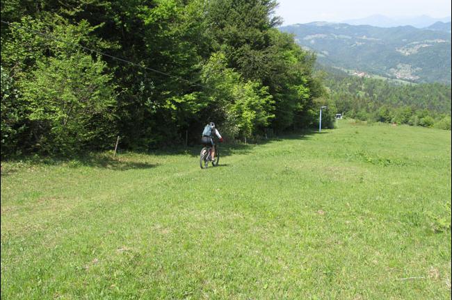 Po nekaj serpentinah se spustimo do kmetije, od koder nadaljujemo po kolovozu naravnost. Vzpenjamo se po travnatem pobočju, in ko prispemo na vrh prevala, na desni ugledamo cerkev Svetega Hieronima v Petkovcu. Nadaljujemo z lepim spustom proti Turkovi grapi. Ko se spustimo do potoka Petkovšca, nadaljujemo po makadamski cesti ostro levo. Po približno šeststo metrih vožnje ob potoku Petkovšca se na desno odcepi kolovoz, po katerem se vzpenjamo v smeri Travnega vrha. Ko nekaj sto metrov pred kmetijo Turk pridemo do asfalta, se držimo levo in navkreber. V trenutku se znajdemo na kmetiji, kjer se cesta konča. No, ne dobesedno. Ko prevozimo dvorišče ugledamo znak za gozdno cesto. Slednja se sicer nadaljuje v gozd, ampak je precej zaraščena in ne pripelje prav daleč. O tem sem se prepričal na lastni koži. Takoj ko prečkamo dvorišče torej ne gremo naravnost v gozd, temveč krenemo po slabšem kolovozu proti Travnemu vrhu (688m). Ko se kolovoz konča, se znajdemo sredi prostranega travnatega pobočja. Pot je najbolje nadaljevati peš ob gozdni meji, preko travnika namreč ni speljane pešpoti. Ko pridemo do antene, nadaljujemo po grebensko speljani pešpoti proti Zaplani. Možno se je sicer spustiti tudi po kolovozu, vendar ta do ceste za Zaplano pripelje precej nižje v dolini. Pešpot je, razen na dveh mestih, kjer je kolo potrebno prenesti preko skalne stopnice, v celoti prevozna. Čisto prehitro se znajdemo na glavni cesti, ki iz Logatca vodi proti Zaplani. Na odseku, ki sledi, velja biti pozoren. Ko pridemo na glavno cesto, zavijemo levo v smeri Miznega Dola, a že čez nekaj metrov cesto zapustimo in se povzpnemo po izredno strmi asfaltni cesti, ki vodi proti vikendom.
