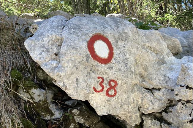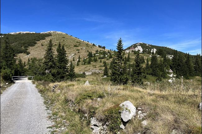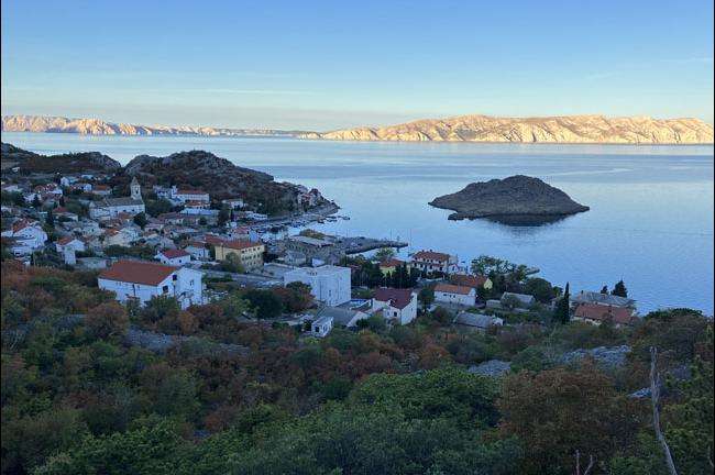 Po ozki asfaltni cesti in lepo speljanih serpentinah hitro prodobivamo na višini. Na tretji serpentini peljemo mimo zadnjih hiš, v nadaljevanju lahko uživamo le še v pogledu na redko poraslo, pretežno kamnito pokrajino. Seveda so veliko privlačnejši pogledi v dolino. Da bi se vrnil do večera, sem se odpravil zgodaj, ravno ko se je začelo daniti. In ravno to je veduto naredilo še bolj slikovito. Ko se je mesto v globoki senci Velebita komaj začelo prebujati, so bile kamnite vzhodne obale Krka, Prviča, Golega otoka in Raba že obsijane s toplim jutranjim soncem. Na višini okoli tristo metrov pripeljemo do borovega gozdička. Veselje ne traja dolgo, saj že po nekaj sto metrih nadaljujemo po isti, pusti dinarski pokrajini.